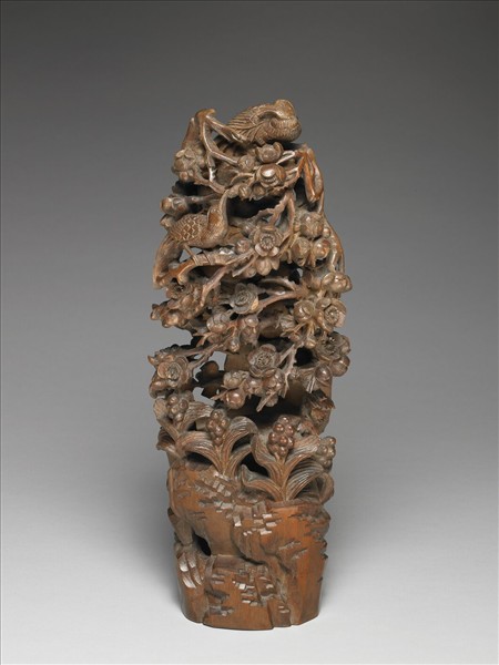 全器以竹根雕刻而成,底部雕刻數座巨石,石頭上方式飾一排百合根,旁有一株花朵密佈之海棠樹,花朵含苞待放或盛開。樹上棲息兩飛禽。