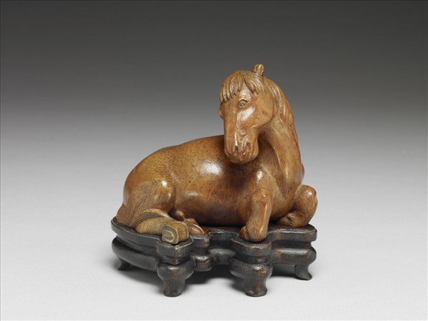 竹雕之馬,呈回首坐姿。馬之面部表情生動,毛髮與肌肉紋理雕刻細膩。全器光滑,以圓雕技法雕刻而成。馬之底部有雙層式底座,座下有五矮足。