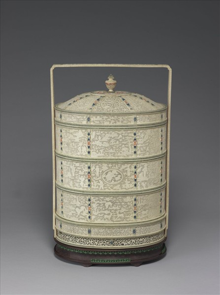 這件象牙雕刻提梁式盒,共四層橢圓形屜格。除底層外,上三層可活動取下。屜格之蓋與各層側壁以雕花染色框條間隔成八格,每層底面則以素框分成七格,每個框格間均嵌入極薄的鏤空象牙片,側壁之橢圓弧度即出於牙片之精巧嵌接。底層象牙片透雕纏枝花草,壁面象牙片細雕人物、鳥獸、草木、樓閣、山水,每一片的題材均不相同;各層底面每一鏤空象牙片的中央,尚雕飾鏤空團花紋,富麗精緻。盒蓋與屜層壁面的象牙片在繁縟的紋飾間,透雕細密的直紋細線襯底,薄如透空花紗,近似透雕牙扇之細緻紋理。寶瓶式蓋頂透雕團花圖案並飾以彩帶,提梁側邊滿雕福壽、人物、花果紋,染以各類色彩。提梁上方鏤雕八蝠與祥雲,左右各四,朝向中央的團壽字遨翔。整件雕鏤紋飾精細繁複,極圖案變化之能事。