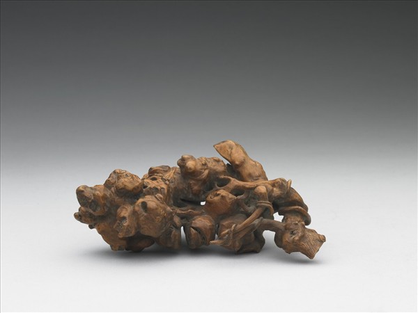 全器就樹根原形,以鏤空雕琢各種瓜果之形,造形寫實奇特,自然天成。此類器作何用途不詳,由其表面磨飾潤澤,推測可能是把玩之物。