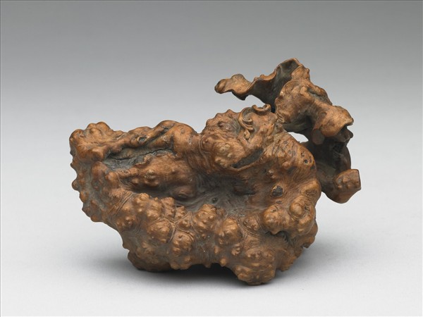 全器就樹根原形加以磨飾,雕成瓜果,造型奇特,一側附枝葉,器表磨飾潤澤,推測可能是把玩之物。