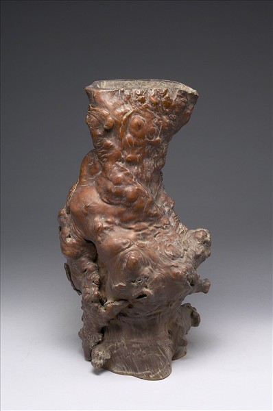 木質,色深棕,表面經摩娑光滑密潤。為樹根的一段,器表佈滿纖維紋理與小樹瘤,自然折轉線條,姿態多端,上端開口挖空為瓶能置物。