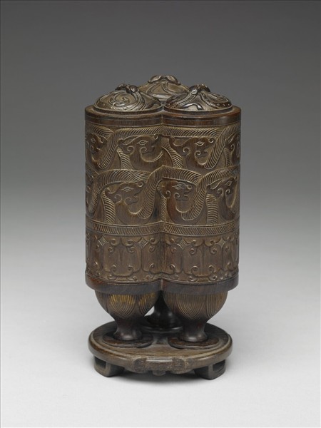 方形木盒,上書「犀抉九枚 甲」,另附有黃籤,寫「時做上等犀抉九枚 缺少五個 紫檀木套匣」。紫檀木套匣呈三圓柱相連之型制。三柱各帶一圓頂蓋,底各帶一高足,三足下連一圓座,座之週邊立有三壁形足。三蓋面浮雕填金相對獸紋,三柱外壁上端陰刻填金龍紋,下方為幾何紋,中有繩紋區隔。圓形座週邊與足飾幾何紋。故雕111-114共四件犀角扳指同置於匣內。