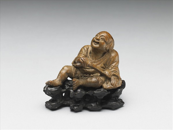 竹木質,雕為持如意童子一尊。童子右手持如意,左手撐扶上半身倚側而坐,右腳伸而左腳曲盤,頭上揚前視而帶笑,坐姿甚為放鬆自在。附鏤雕湖石花葉紋木座。