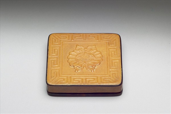 葫蘆。長方形小盒,罩式蓋,矮壁,淺座。蓋面作對蝶紋,周圍連續回紋一圈。其造形與紋飾乃利用葫蘆天然生長時加以塑模而成,成功率極低,故極為難得。盒內有火鎌與荷包。