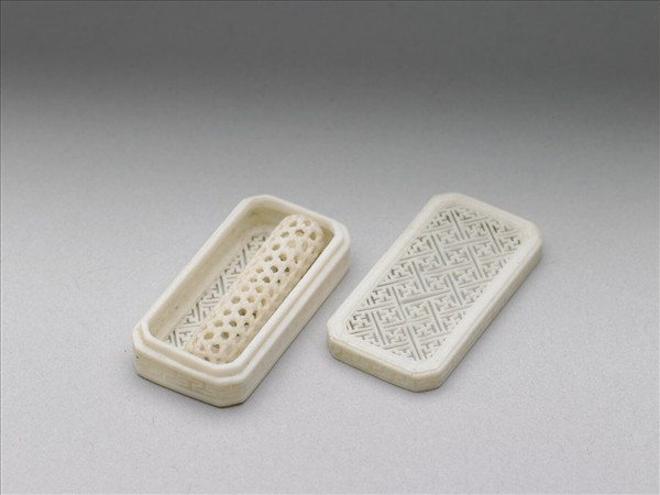 長方委角象牙小盒,盒身鏤雕卍字紋,為象牙長方套盒中的一件,內裝一只象牙飾品。套盒全器共十一個象牙盒,其中大小形狀不同的十個小盒,皆需裝入最大盒中,十個小盒或附果盤,或連鏈附動物、瓜果,或僅連鏈而以鏤空葫蘆形小牙飾、磬形小牙飾連接,形形色色,不一而足;其中有數個小盒之蓋面、器身飾鏤空活紋。最大盒器身底面陰刻填黑楷款:「乾隆己未巧月,小臣黃振效恭製。」乃在乾隆四年七月完成的作品,原為「『集瓊藻』多寶格」中的文玩之一。黃振效這種連鏈、活紋小盒(尤其是套盒)乃廣東牙匠的絕活,實可謂集精鏤細刻之極致。