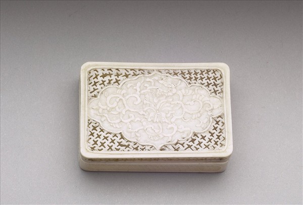 長方形圓角象牙小盒,器身鏤雕十字紋,盒蓋中央浮雕番蓮紋,為象牙長方套盒中最大的一件。套盒全器共十一個象牙盒,其中大小形狀不同的十個小盒,皆需裝入最大盒中,十個小盒或附果盤,或連鏈附動物、瓜果,或僅連鏈而以鏤空葫蘆形小牙飾、磬形小牙飾連接,形形色色,不一而足;其中有數個小盒之蓋面、器身飾鏤空活紋。最大盒器身底面陰刻填黑楷款:「乾隆己未巧月,小臣黃振效恭製。」乃在乾隆四年七月完成的作品,原為「『集瓊藻』多寶格」中的文玩之一。黃振效這種連鏈、活紋小盒(尤其是套盒)乃廣東牙匠的絕活,實可謂集精鏤細刻之極致