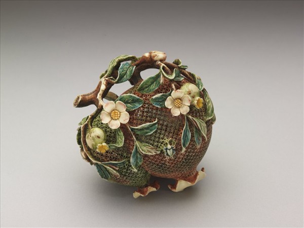象牙雕石榴盒,鏤雕枝頭石榴花葉纏繞,果實皆鏤雕雙錢錦地紋,整體再加以茜色,盒壁極薄且玲瓏通透。