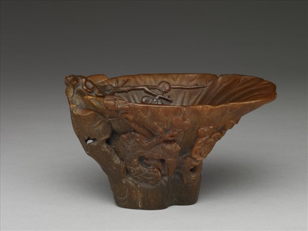 全器取一犀牛角,截去尖部,掏挖內壁,雕成一片向上收捲的大荷葉,內外壁皆淺浮雕葉脈,外壁高浮雕花卉、靈芝與山石,一花枝伸入器內壁,枝頭花兩朵,一含苞,一側開,並藉高突之山石與靈芝為鋬。通體呈暗褐色,底部呈黑色。