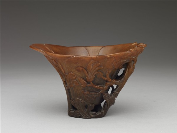 器取一犀牛角,截去尖部,掏挖內壁,雕成一朵向上盛開的大玉蘭花,內外壁皆淺浮雕花瓣,外壁高浮雕玉蘭花葉與枝梗,並以突出於器底的枝梗繞成足,又高浮雕二枝梗為鋬。通體呈暗褐色,底部呈黑色。以朵花或葉片為形制之犀角盃,似乎盛行於明晚期,儒士汪道昆(1525-1593)《太函副墨》卷二十同時收錄了「犀葵杯銘」與「荷葉犀杯銘」,或可為證。