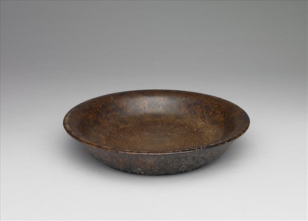 撇口,淺壁,平底,圈足。以棕樹根削製而成,全器光素,顯露原有木質紋理,底部有陰刻填綠楷體御製詩「文洗栽嘉木,連林尚憶青,華為君子服,朴具古時形,竹染湘妃淚,屏開孔雀翎,湯銘身是澡,禹錫德惟馨,如彼均宜用,伊予奚所寧,飲淳兼葆素,永以佩芳型。乾隆御題。」及陰刻填紅印。附五足木座一只。