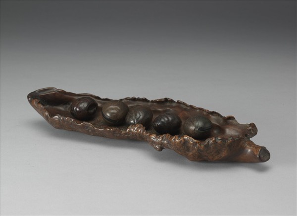 癭木蕉葉盤,這類以具有特色而天然生成的枝幹、葉、果等為原型,製為文房中的陳設與用具,在明代晚期文人生活中甚受歡迎。癭木蕉葉盤節取癭木天然形狀,盤背兩側保留天然錯結的木質,中央莖脈處平磨,刻「蕉林珍玩」,並刻印二:「墨林」、「子京珍玩」。盤面丙戌年(乾隆三十一年,1766)高宗題識:「清供天籟閣中曾,既曰根云葉亦應,設擬鄭人夢駭鹿,植生猶覺近堪徵。」詩文內容談及此盤曾在項元汴(1525-1590)天籟閣的收藏,又由蕉葉聯想到《列子.周穆王篇》鄭國人覆蕉尋鹿的故事,因此高宗於盤底加刻「蕉緣」二字,望著桌案上陳設著一片如蕉葉狀的木癭,外緣卷起,再擱上果核五粒,外皮天然皴皺,瑩滑可愛。