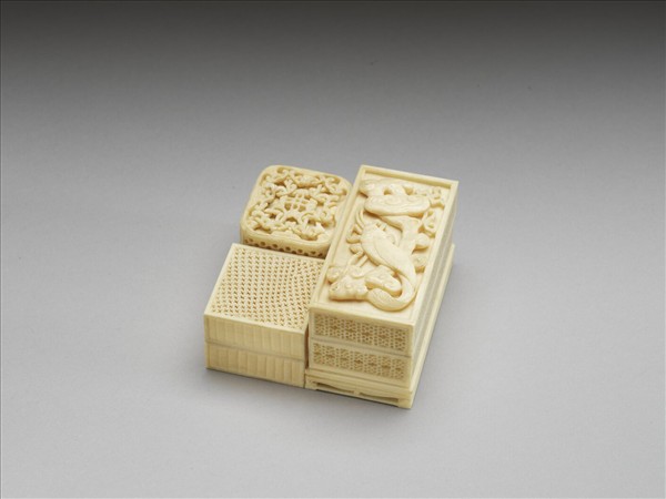 清代物。以象牙雕成,三盒底部相連;一大二小。大盒面浮雕魚一尾,卍字一及靈芝數朵。長方小盒,盒面雕斜形十字紋。橢形小盒,盒面雕作勾連結狀紋,可以活動。三盒之週邊花紋各不相同,高低亦不一致。