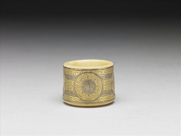 雕牙骨嵌金銀絲扳指現存八件(故雕226-233),以金、銀絲鑲嵌如蟠螭、異獸、雲紋、龍獸紋或其他幾何紋樣為裝飾,每件器上皆有四個雙圈圖案,以篆書鑲嵌金絲「乾隆年製」或「乾隆御用」款。這套扳指以造型特殊的紫檀套蓋盒盛裝,外觀為三連獸足,套蓋上佈滿交錯的陰刻填金蟠螭紋,蓋內為三層盒,每層裝扳指三個。扳指本身的製作及外盒的雕工與造型設計,皆展現清代雕刻、金屬鑲嵌技術與包裝藝術的特色。