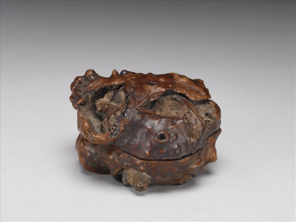 盒,不規則形,子母口。取天然癭木,略加修飾琢磨而成,外表呈現原有形態,內部髹黑漆。用來貯備香木段或香餅,為薰香時用器。