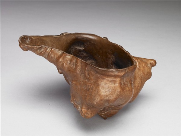 以癭木製成,形如海螺,中空,橫截磨礱以為筆洗,木紋旋繞如螺、如花,而瑩澤可喜。口緣有四槽一團,可能原有鑲嵌物。側壁刻銘︰「駿之蛻,何纍纍;蟬之蛻,何娓娓;何若山螺之蛻,日以酌乎泉之醴。容巢。」容巢,不可考。