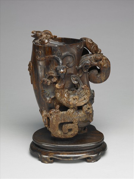 器形仿製西漢角形玉杯之形制與紋飾雕製而成,全器以鏤雕與浮雕,結合鳳紋、螭紋與龍紋,在鋪首上方刻「乾隆年製」隸書款,是重要的仿古陳設器。後配錫匣、文錦匣與錦袱,並刻款,入乾清宮收藏。