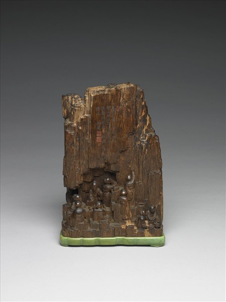 以整塊茄楠木雕刻「香山九老」,即唐武宗會昌五年(845),詩人白居易於洛陽香山,與八位七十歲以上致仕友人的文會場景。下方有︰「乾隆辛酉年小臣楊維占恭製」刻款,為廣東牙匠楊維占,刻於乾隆六年。同時正面山壁刻有乾隆六年(1741)十二月之〈題刻畫伽楠香山九老圖〉,收錄於清高宗《御製詩.初集》。此件正面按香材紋理斧劈淺刻出高聳山壁,將人物集中於山下,老者們或坐或站或提筆書壁,姿態各異,更有僮僕蹲坐執扇烹,山岩以側刀淺刻短截,餘取香材天然形勢不加斧鑿。帶染色象牙座。不僅材質珍貴,其雕工簡約洗鍊,構圖巧妙呈現形小象大的氣勢,為乾隆時期陳設器極精好之作。且據《活計檔》記載,此件於乾隆七年(1742)時,配文錦匣,入乾清宮頭等收藏。
