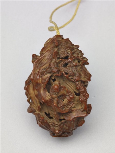 此件核雕構圖與南宋馬麟〈靜聽松風〉相似,古松聳立於山石岩壁間,一高士斜倚憩坐於松蔭下,正凝神諦聽迎風搖曳抑揚迴蕩的松聲,後有一侍童側立。背面則雕鹿佇立於松石間。雕工精湛,人物表情姿態生動自然,衣紋線條勁健流利,利用如斧劈皴般的刀法,結合果核本身堅硬質感,顯現山間巨石的氣勢,奏刀俐落,暢快淋漓中不失細節,且意境幽遠。