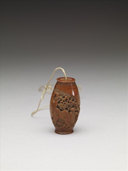 在山間古松垂蔭下高士倚石而立,仰望天空中的飛鳥,後有一人步行於山間小路,以透雕浮雕並用凸顯畫面主題,以陰刻細線表現雲朵,呈現空間感,在構圖及雕刻技法上的妥善運用與處理,呈現出如繪畫般的核雕微型世界。