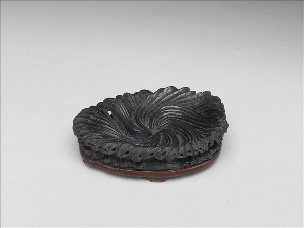 木製,圓形,黑色座面浮雕雙層漩渦狀水波紋,下方連接一褐色四足座。盛放雕竹荷蟹水盛(故雕207)。
