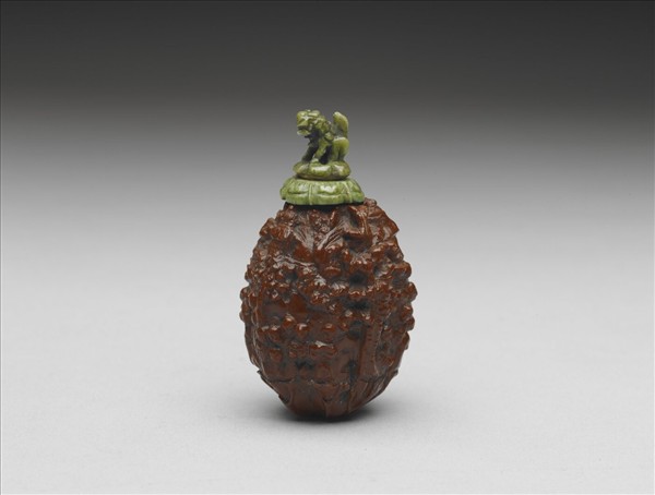 核桃上雕十八羅漢於樹石間,底部雕荷葉為托,以茜牙獅紐為蓋,牙雕靈芝為匙,結合各類材質,整體搭配細節考究。