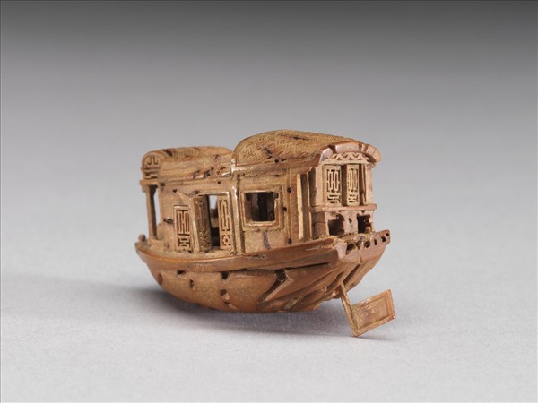 此件作品舟底為清晰可見的果核天然紋路,船頂削平,淺刻作蓆編草棚狀。船艙分三部分,中艙長桌上陳設茶壺、杯盞、瓶花,門前刻著對聯:「好風能自至,明月不須期。」門窗六扇,俱可外推,後艙小窗可掀起,並有活動式船舵,足見匠人巧雕的用心。