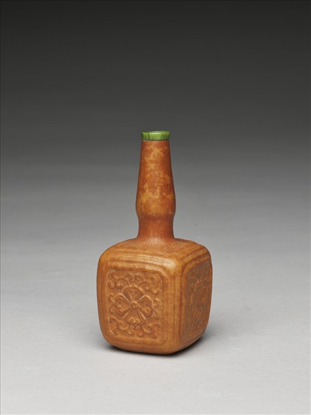 葫蘆模製長頸四方瓶。模塑四面開光四瓣蓮紋,底部亦有花為飾。