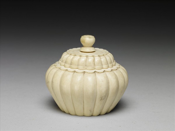 以象牙雕刻而成之蓋罐,全器周身雕刻成菊花形,蓋亦呈菊花式。此器斂圓口,斜肩,腹上豐下斂,平底。底部刻有多圈同心圓。蓋頂帶一圓球鈕,口緣邊雕飾一圈花瓣紋。