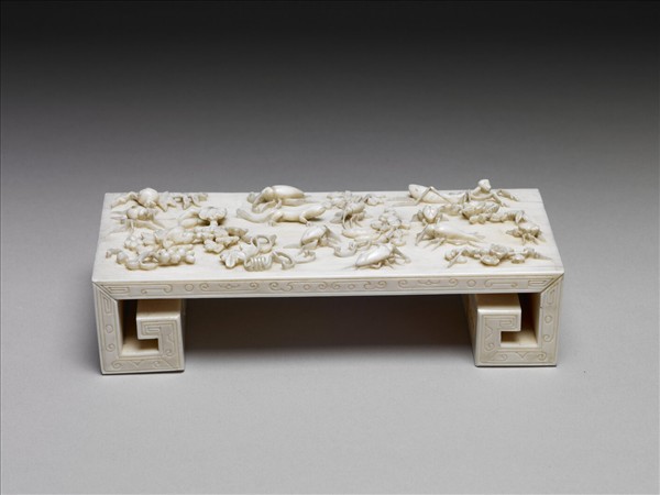 這件墨床作小方几式,以器面與二迴紋卷足接合而成。器面精雕各種細小的花卉和昆蟲,隱約成排的草蟲分佈錯落,各據一方。几底還雕刻一幅山水人物圖,前景一大樹,中景二持杖老者和一童子,越過水岸,遠處是三兩亭子和層疊的高山,雕刻的層次十分豐富,几面薄可透光。