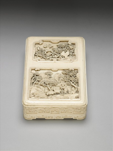 以象牙雕刻而成之長方形文具盒,盒底四周邊框雕刻幾何紋飾,盒蓋由蓋面與四周邊框組合而成,四邊框分別雕刻拐子龍紋與如意雲紋。蓋面分成上、下兩開光,上開光內浮雕竹、各式花卉、奇石與彩蝶。下開光內浮雕村童牧羊圖,一童倚仗而立,一童坐臥於樹下。圖中帶遠近交錯之岩石、松樹與梅樹,背景有一小屋。