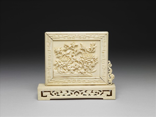 以象牙雕刻而成之插屏,插屏由四長方形邊框與一面板組合而成。其中一邊框側邊附一鏤雕龍紋。四邊框正面浮雕回紋,背面浮雕幾何紋與波濤紋。面板浮雕各式含苞、盛放之花卉、奇石與棲息枝頭之飛禽,意象生動,背面光素無紋。插屏下方有一長方几式座,足部二回紋足朝內捲起,表面陰刻幾何紋。二足間有一橫槓,槓上有一鏤空相對龍紋與如意雲紋。