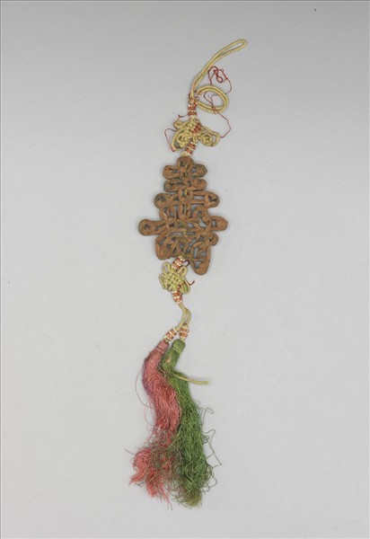香木牌,鏤雕蘭花花葉組合之壽字紋。上下端繫黃縧飾結子,結上下及紅、綠流蘇飾珊瑚和珍珠的緝米珠。