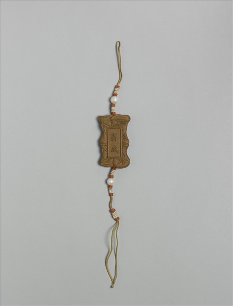 全器呈竹節式,兩面中央開光,浮雕「齋戒」及滿文齋戒同義字。通心穿,黃縧上下各綴珍珠及紅白米珠。