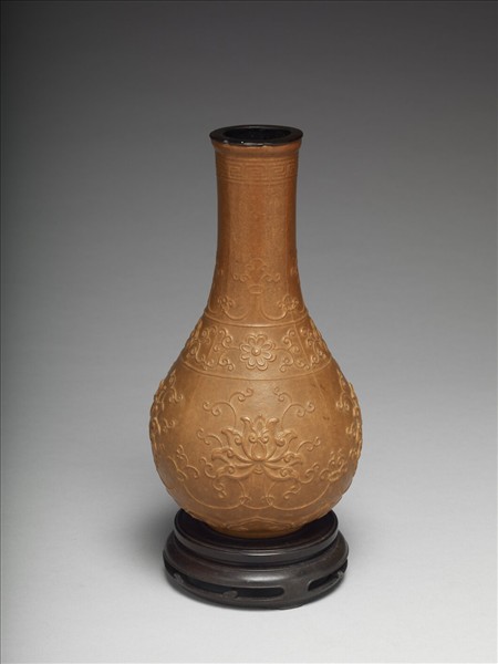 此件康熙年間模製葫蘆長頸瓶,口沿鑲玳瑁邊,瓶身四股模製稜線隱約可見,紋飾由上而下分層環繞,包括口沿下方環繞一圈回紋,頸部飾以如意雲紋,肩部為朵花卷草紋,腹部為纏枝番蓮紋,器腹下方飾一圈如意雲頭紋。圈足中央有模製單線方框「康熙賞玩」楷款,圈足上有楷書陰刻填綠乾隆四十六年(1781)御題詩,盛讚葫蘆器渾然天成之美,並刻有陽文填朱地「古香」印。此瓶整體造形典雅,線條圓轉,深雕淺刻層次井然,足見雕模技藝與範製過程之精審,結合葫蘆樸質與造化巧妙,是康熙御製葫蘆器之經典,亦反映出康熙皇帝在藝術品鑒創製中所注入格物研精的實驗精神。