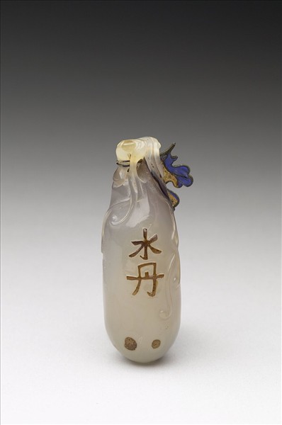瑪瑙,色白有灰斑。全器為瓜形,瓜白葉灰,並用赭色之皮,浮雕「水丹」二字。在上端另纏有鎏金銅葉,點翠脫落。