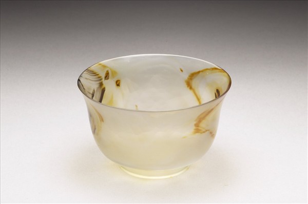 半透明灰白色瑪瑙質,有黃色及黑色帶狀紋理。微撇口,深腹,圈足。器壁極薄,光素無紋。外底琢有「雍正年製」篆款。