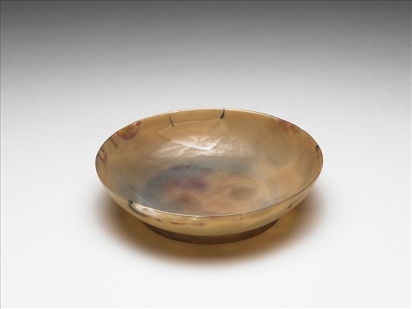 不透明褐色瑪瑙質,有黑褐、橙與白色帶狀紋理與斑點。侈口,弧形淺壁,圈足。全器光素無紋,外底琢「乾隆年製」四字篆款。
