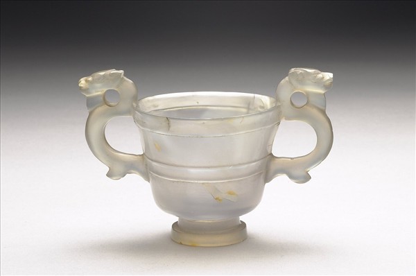 灰濁半透明瑪瑙質,有些微黃色斑點及璺。侈口,深腹,杯身似圓筒型往下逐漸內收,高圈足,有螭首雙耳,耳下戴玦,器身有凸弦紋二道。附瑪瑙八角盤。