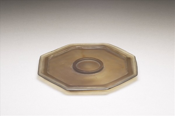 不透明灰褐色瑪瑙質。八角形淺盤,淺斜壁,淺圈足,盤內凸雕一圓托,可以承杯。全器光素無紋。本件為瑪瑙雙耳杯之杯盤。