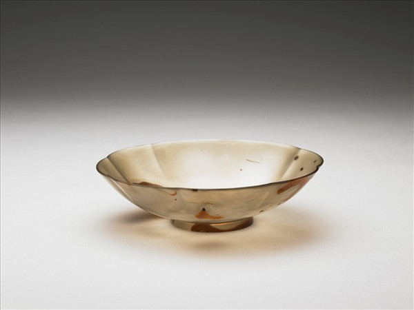 透明淺褐色瑪瑙質,有紅與橙色斑點與眼。侈口,弧形壁,碩腹,淺圈足,口沿作八瓣葵瓣形。器壁極薄,光素無紋。外底琢「雍正年製」四字篆款。