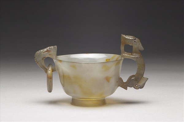 不透明灰白色瑪瑙質,有黃色斑紋,並巧妙利用瑪瑙顏色變化來進行雕琢,杯身主題為灰白色,杯耳小螭則呈深褐色形成對比。一耳作一螭攀附狀,一耳立雕獸首,並有活環。撇口,直壁至杯底漸收,圈足。