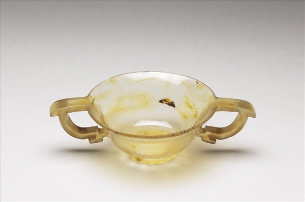 瑪瑙質,侈口斂腹,有圈足,器壁透亮並略帶淡黃色斑,兩耳略近丁字形,全器光素無紋。