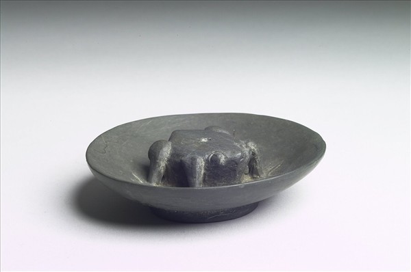 石質,色澤黑灰。全器琢為小碟,碟心有一蟾蜍,蟾蜍作匍匐欲跳躍狀,背上有一孔。