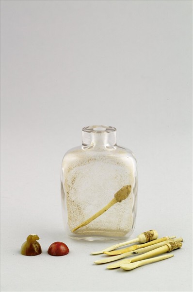 長方形鼻煙壺,帶玻璃蓋及紅料蓋頂。玻璃材質,質地清澈、透明,無蓋。