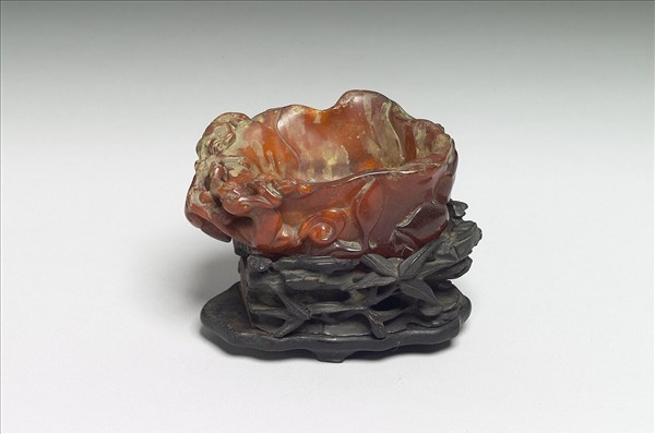 深黃色琥珀水盛。全器作花瓣形,內壁雕螳螂一隻,外壁雕花朵松鼠。附木座,鏤雕竹葉湖石。