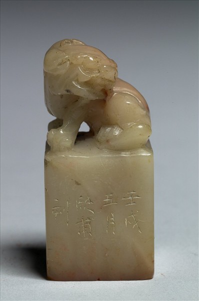 壽山石。方印、獅鈕,陽文加框「指墨」二字。邊款陰刻「壬戊五月欣甫刻」、「聚之」。