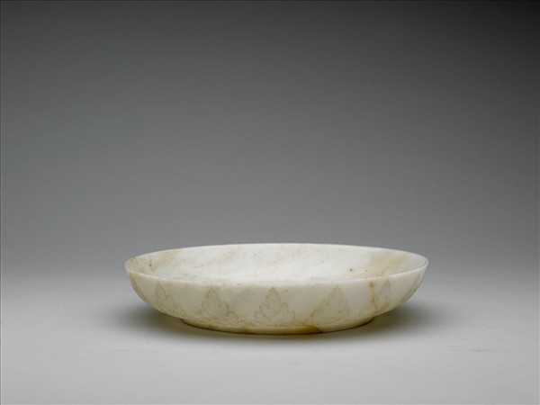 玉質,局部沁為黃色。雕作一厚重大圓盤,盤底雕平展的蓮花。腹壁上琢莨苕葉紋一周。紋飾頗精。