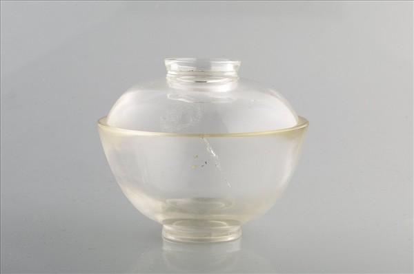 水晶,潔淨透明,微有雜質。侈口、弧腹、圈足,附鈕蓋。平素無紋。於清宮收藏時,有七件水晶蓋碗合儲於木箱內。