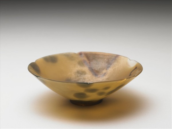 瑪瑙質,黃褐色,有赭黑色斑,黃濁微透。器作六瓣花形,撇口,斂腹,圈足,全器光素無紋,圈足內琢「乾隆年製」四字篆款。